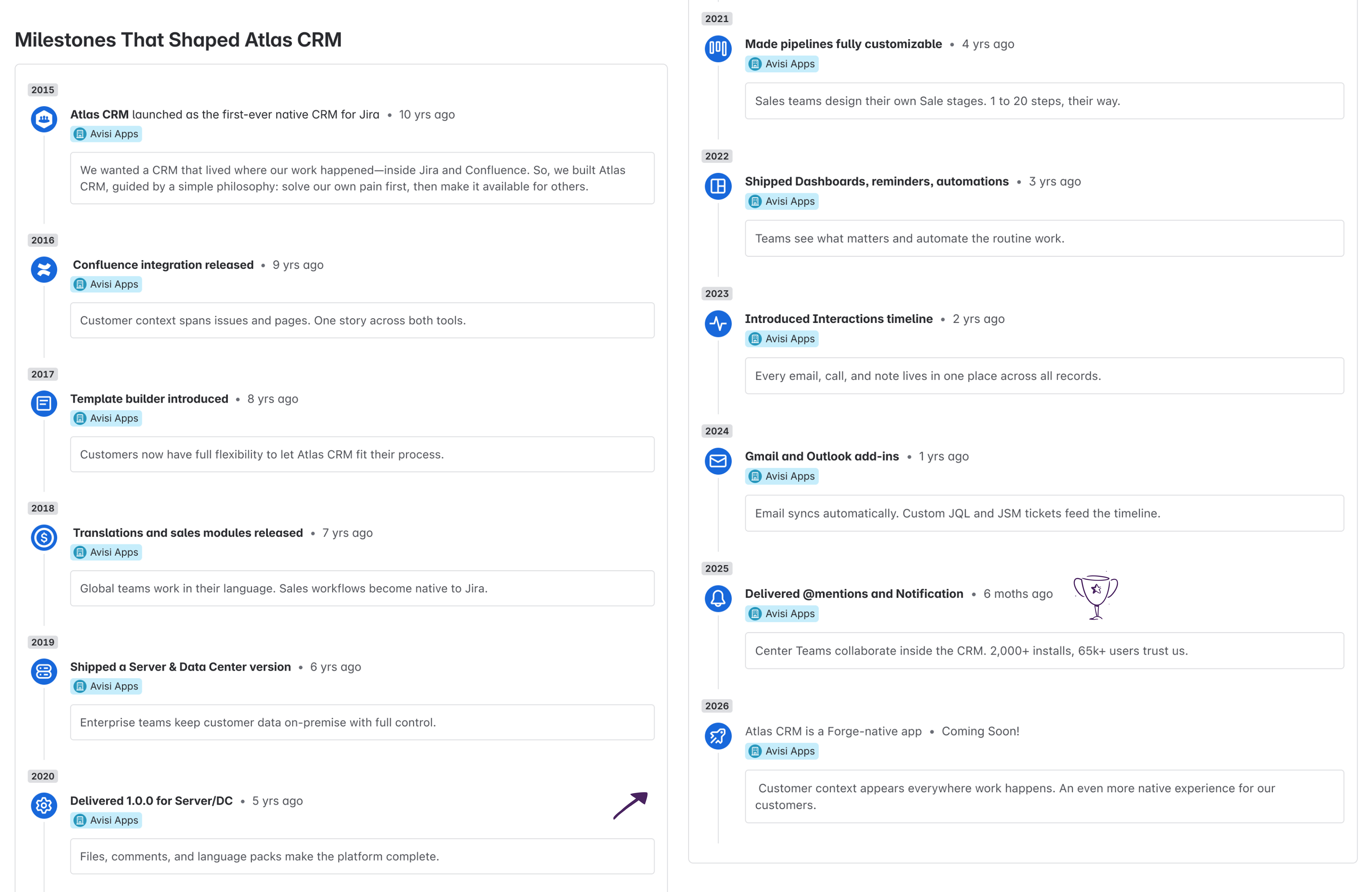 Ten candles for Atlas CRM also mean ten candles as part of the Atlassian story. Without Jira, Confluence, and the Marketplace, Atlas CRM wouldn’t exist. So while we’re celebrating, we’re also raising a glass to Atlassian for building the ecosystem that made this decade possible.